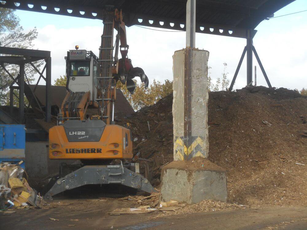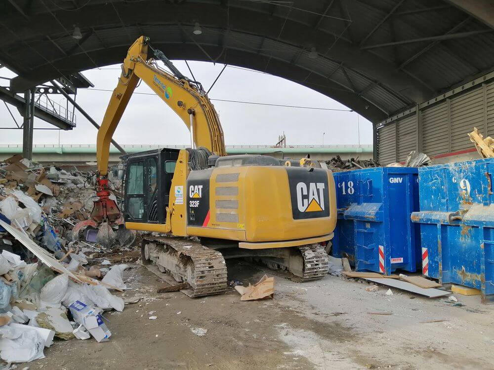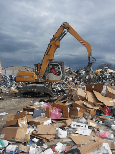 - camiones circulando alrededor de cargadoras o excavadoras en un sitio de reciclaje